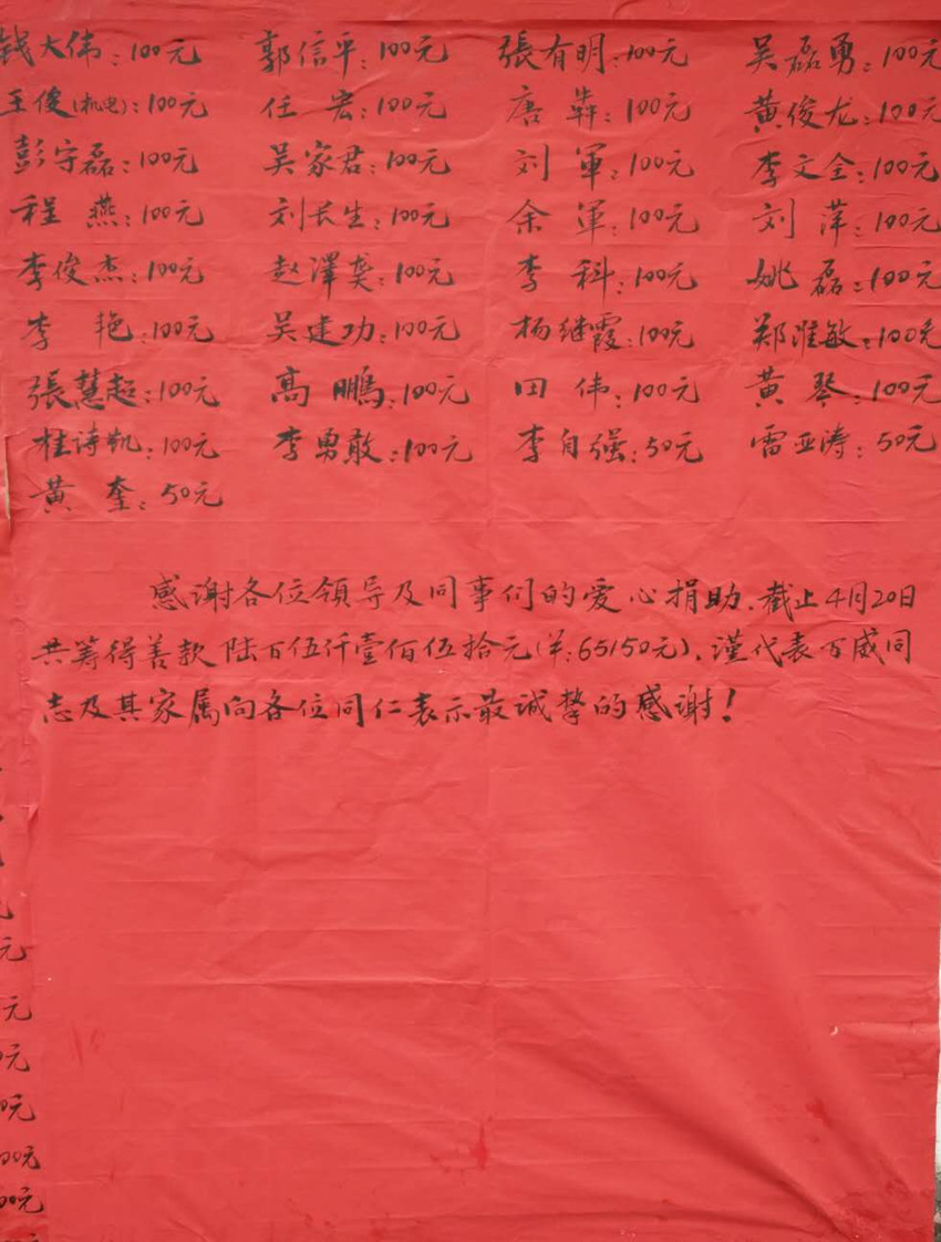 “一方有难,八方支援。”公司在得知万威身患重症,家庭困难的情况后,立即组织员工开展“送温暖、献爱心”募捐活动。公司全体员工纷纷伸出援助之手,踊跃捐款,慷慨解囊,共捐款65150元。