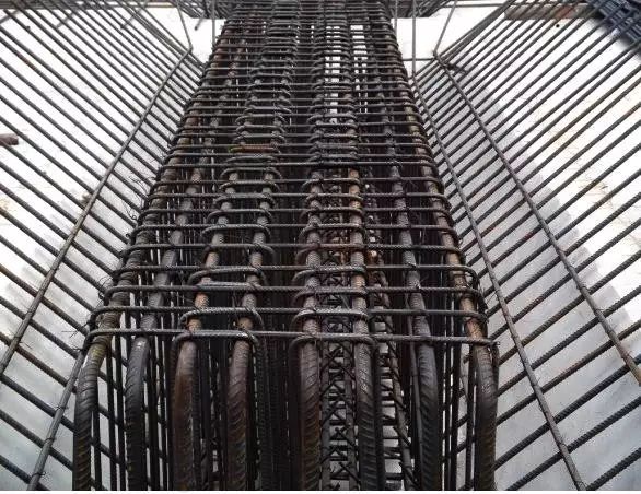 5、角部竖向钢筋弯勾与模板成45度角,中间钢筋弯勾与模板成90度角。