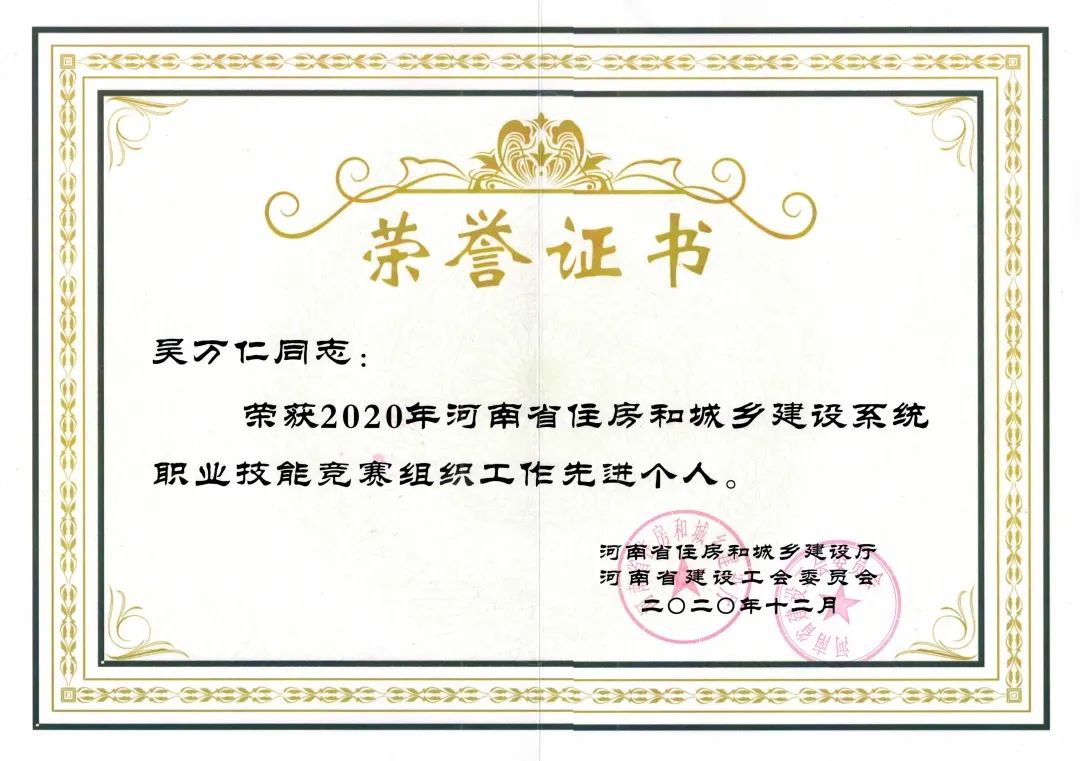 一分耕耘一分收获,得益于积极的组织以及在竞赛中取得的优异成绩,公司荣获“2020年河南省住房和城乡建设系统职业技能竞赛组织工作先进单位”称号、吴万仁董事长荣获“2020年河南省住房和城乡建设系统职业技能竞赛组织工作先进个人”称号。