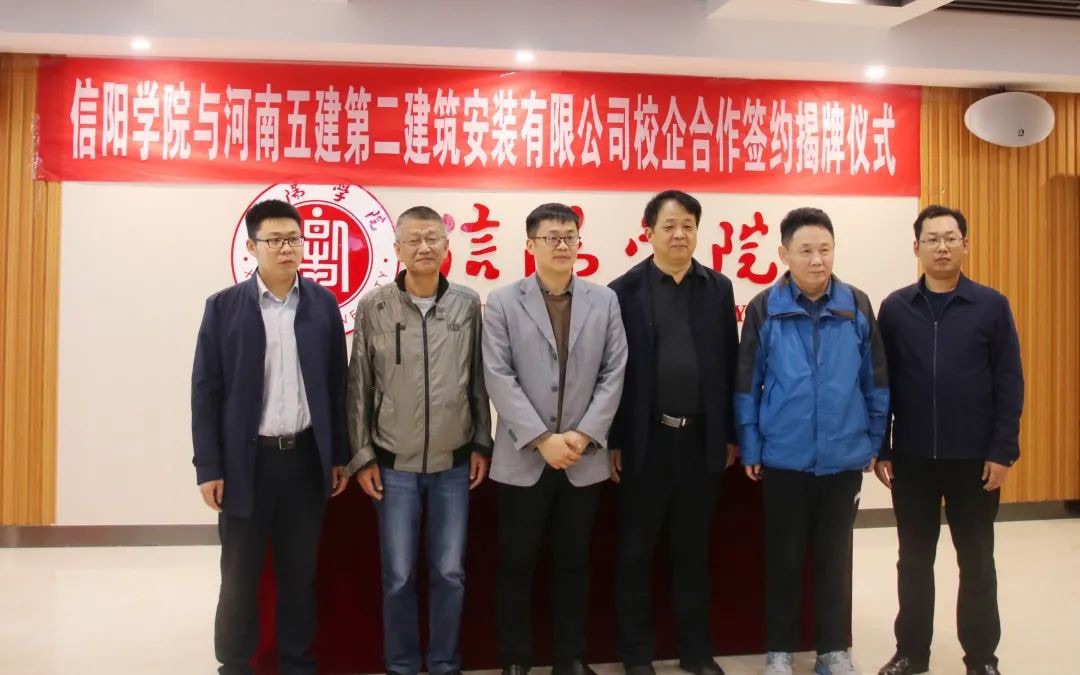 在热烈的氛围下,吴建功和杨高伟共同签订了河南五建二公司与信阳学院校企合作协议书。杨高伟、郭二军、谭笑非、吴建功共同为“实践教学基地”“人才培养及项目研发基地”揭牌,双方领导亲切合影留念。